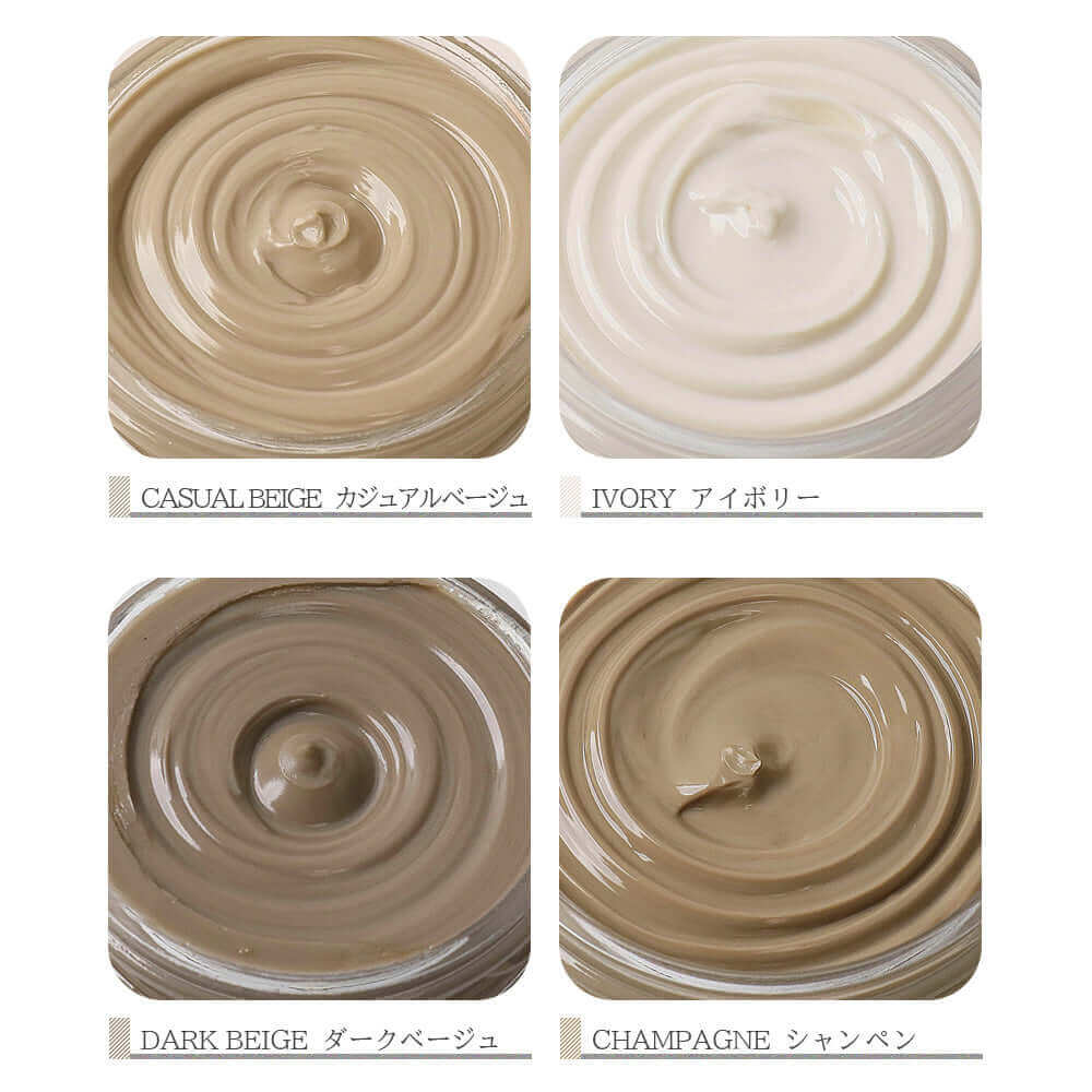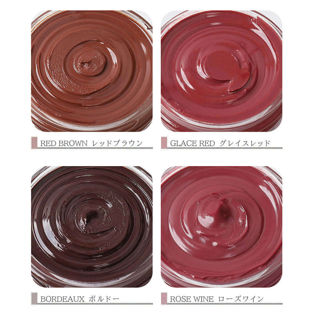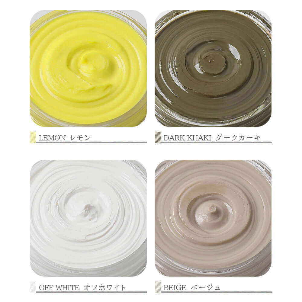 | 品質表示 | 成分:ワックス、乳化剤、有機溶剤、香料、防腐剤、水 (オフホワイト、ベージュ、アイボリー、レッドは染料及び顔料、それ以外は染料) 内容量:35ml |