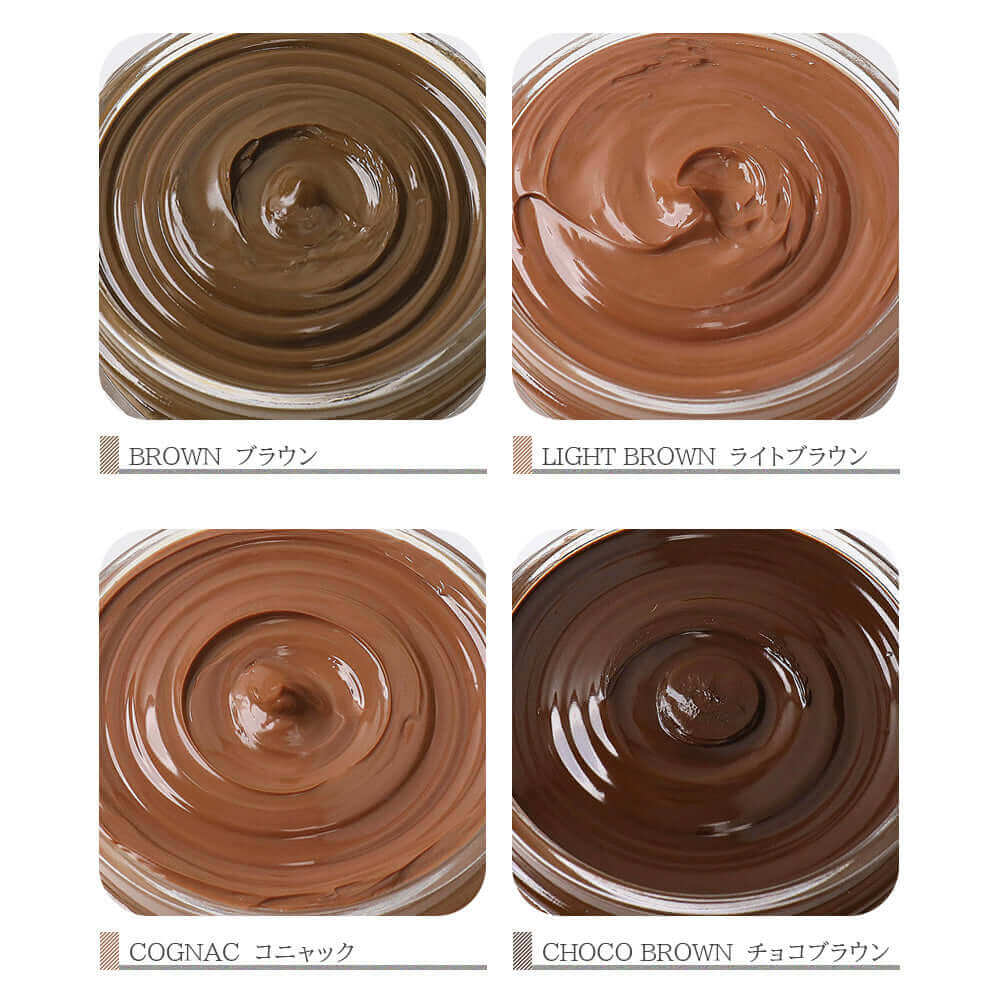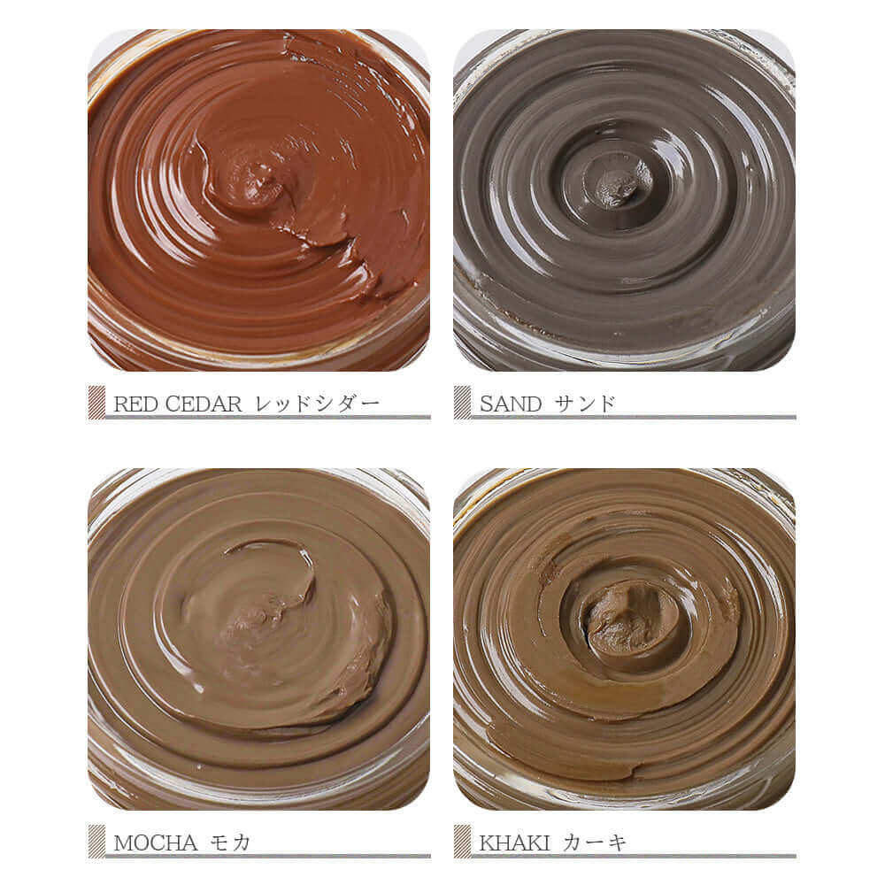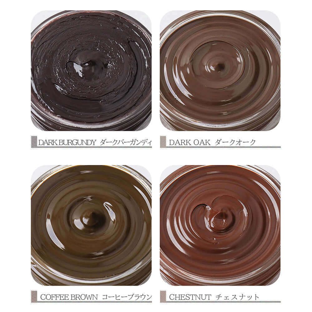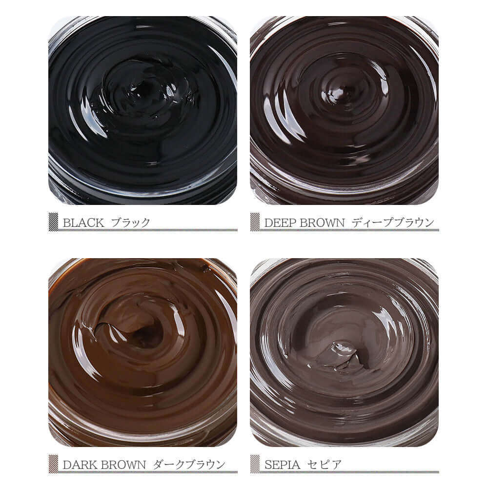 | カラー | ブラック(黒)、ディープブラウン、ダークブラウン(こげ茶)、セピア、ダークバーガンディ、ダークオーク、コーヒーブラウン、チェスナット、ブラウン(茶色)、ライトブラウン、 コニャック、チョコブラウン、レッドシダー、サンド、モカ、カーキ、ウィスキー、キャメル、ダークキャメル、ニュートラル(無色)、レッドブラウン、グレイスレッド、ボルドー、ローズワイン、レッド(赤)、パープル(紫)、ブルー(青)、ダークブルー、ネイビーブルー(紺)、グレー(灰色)、 ライトグレー、レモン(黄色)、ダークカーキ、オフホワイト、ベージュ、カジュアルベージュ、アイボリー、ダークベージュ、シャンペン、ダークグリーン(緑)、ライトグリーン、 オリーブグリーン |
