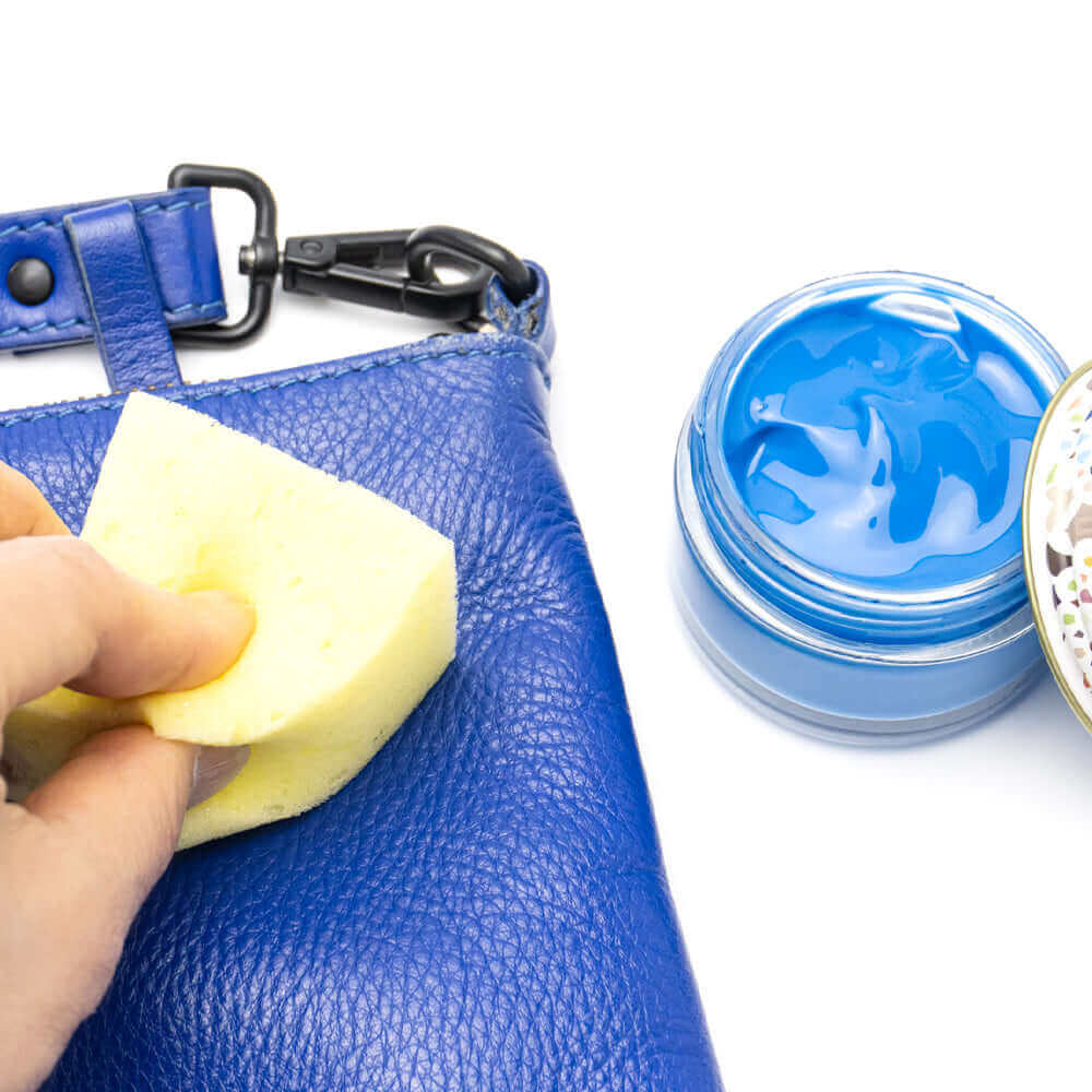 ブラシで軽くホコリを落としてから、レザーモイスチュアを布やスポンジに少しずつ取り、革製品全体にまんべんなく塗ります。あとは、柔らかい布でからぶきするだけでOK。磨き込みのブラッシングは必要ありません。