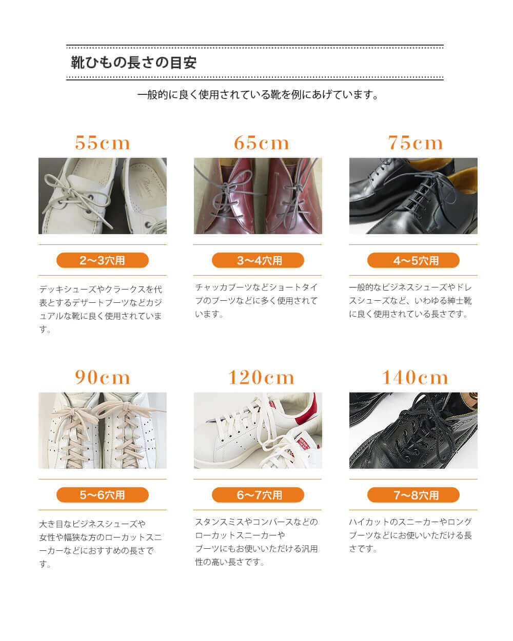 | 使用方法 | 55cm ・・・2~3穴 65cm ・・・3~4穴 75cm ・・・4~5穴 90cm ・・・5~6穴 120cm ・・・6~7穴 140cm ・・・7~8穴 ・靴の穴数に合わせてお選び下さい。 ・上記はあくまで目安です。靴や穴の幅によって異なる場合があります。 ・長さには多少の誤差があります。 ・ご使用の靴紐のサイズ(長さ)をご確認の上、お選び下さい。 |