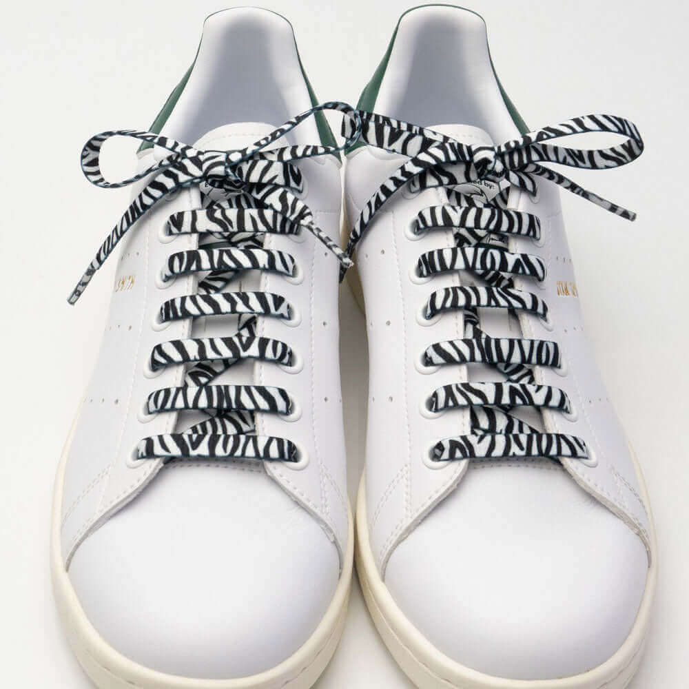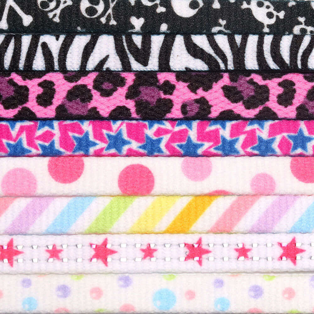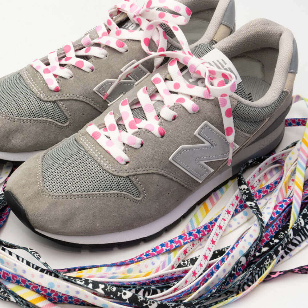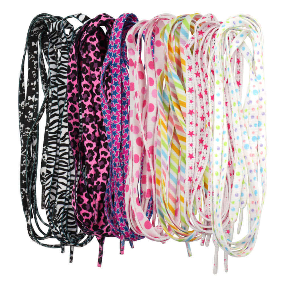 ゼブラやヒョウ柄、水玉など、様々なプリントがカラフルでポップな靴ひも(シューレース)です。可愛らしいプリント模様で、紐も柔らかいのでお子様のスニーカーにもおすすめです。