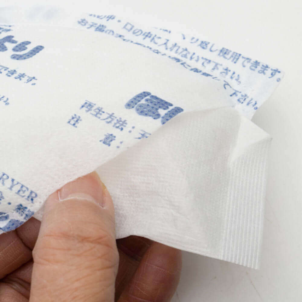 | 注意 | ・本品を直接水で濡らしたり、洗ったりしないで下さい。 ・コンロ・アイロン・ストーブなどの直火乾燥は避けて下さい。 ・幼児の手の届くところへ置かないで下さい。本品は 食べられません。 ・使用後は不燃物として捨ててください。 ・その他、パッケージ記載の注意事項をよく読んでからご使用下さい。 |