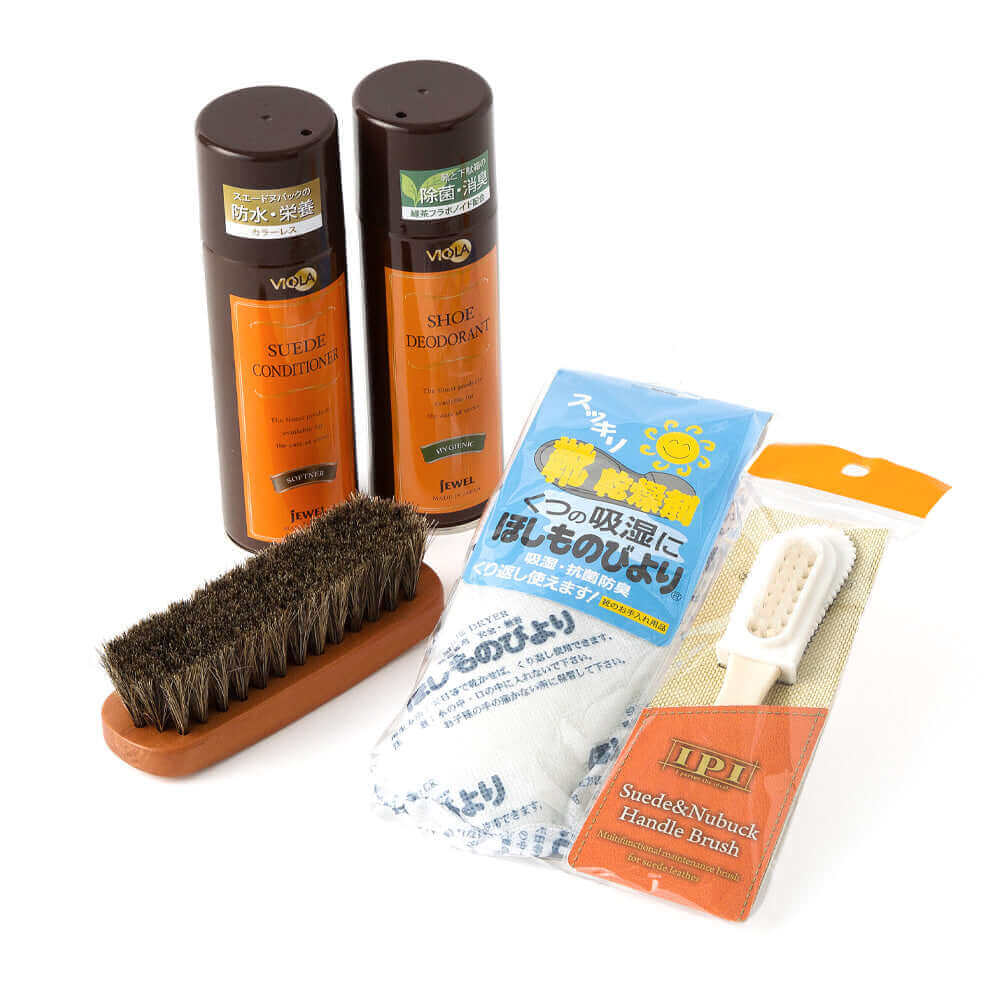 | 内容 | ●ヴィオラ スエードコンディショナー(カラーレス)×1本 ●ジュエル ホースヘアブラシ×1本 ●イピ スエード・ヌバック ハンドルブラシ×1本 ●ヴィオラ デオドラントスプレー×1本 ●靴用乾燥剤 ほしものびより(両足分)×1個 ●ヴィオラ ムートンブーツ ファーストケアセット使用方法説明書 |