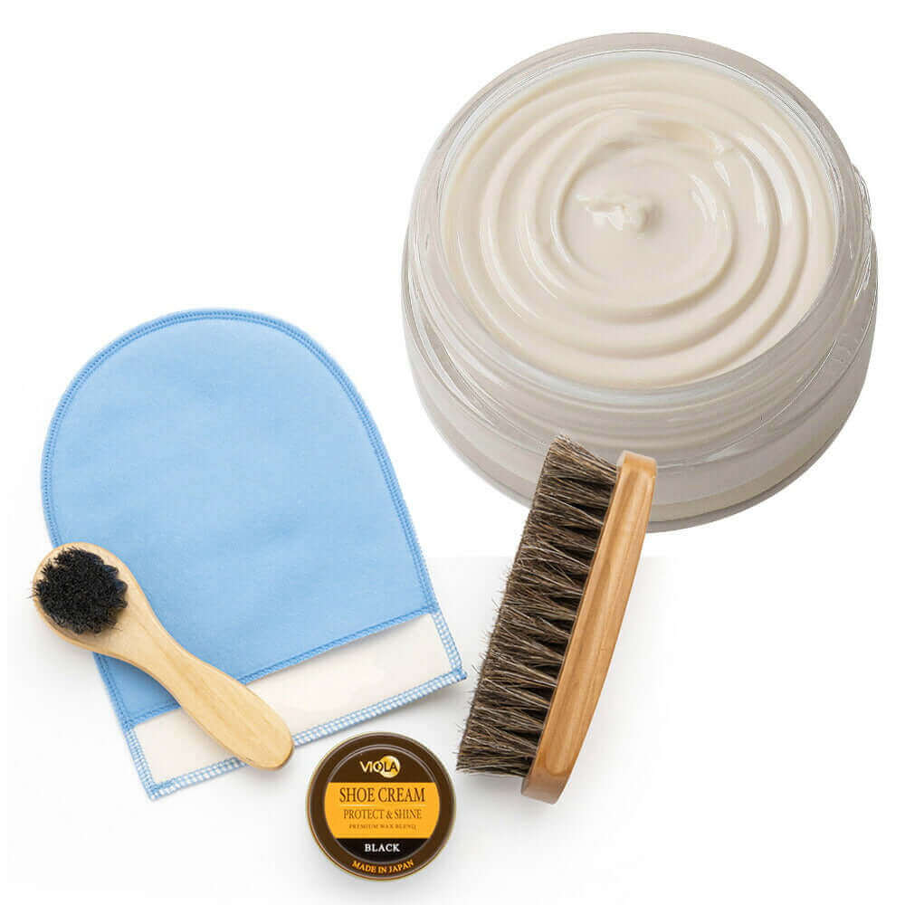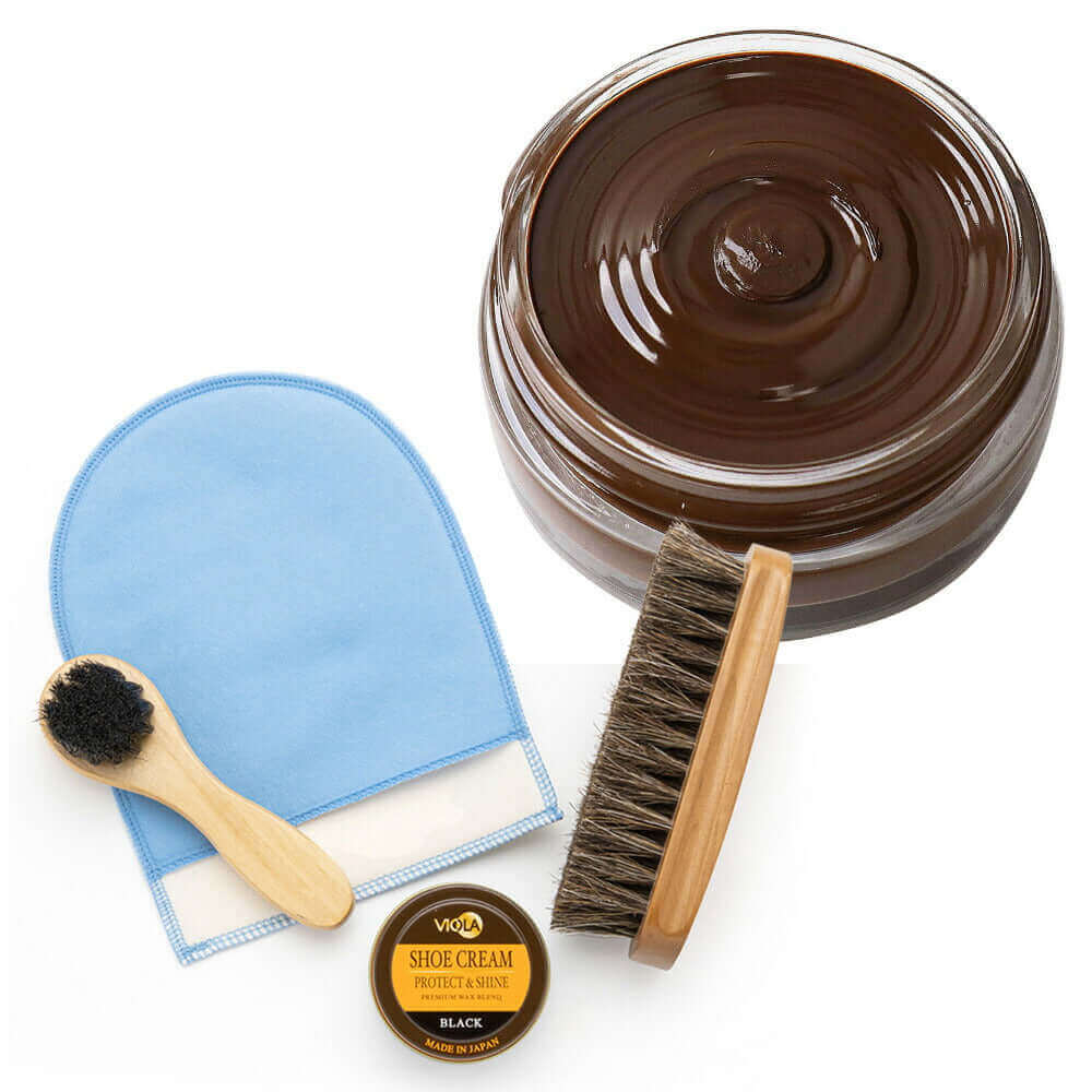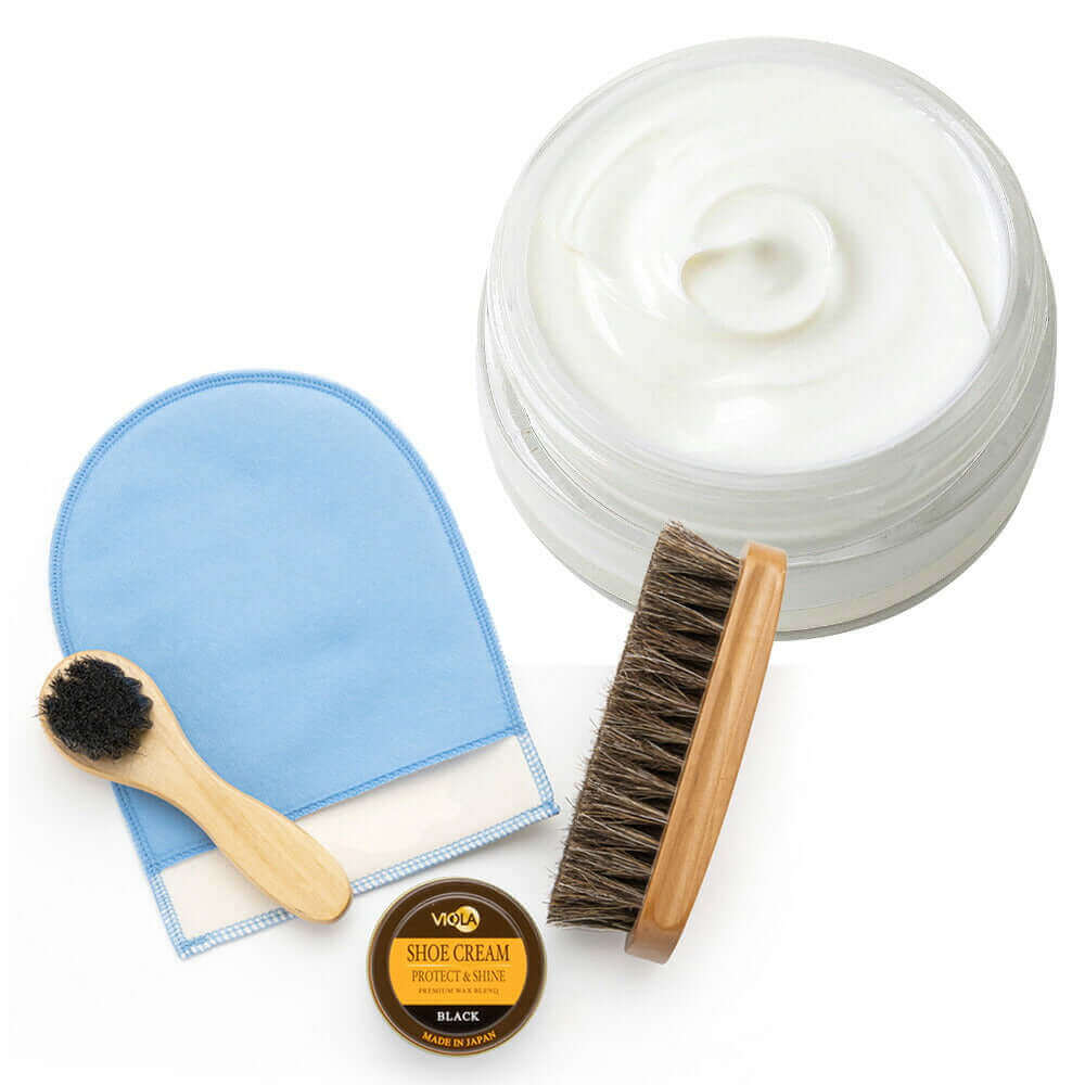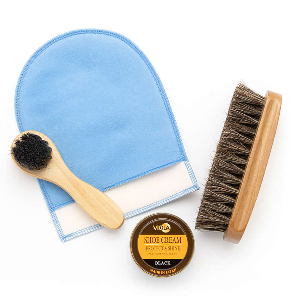 ヴィオラ シュークリームと馬毛ブラシ、ハンドルブラシのシンプルな靴磨きセット。仕上げ磨きミットのおまけ付で更にお得!シューケアセットの買い足しにもおすすめです。