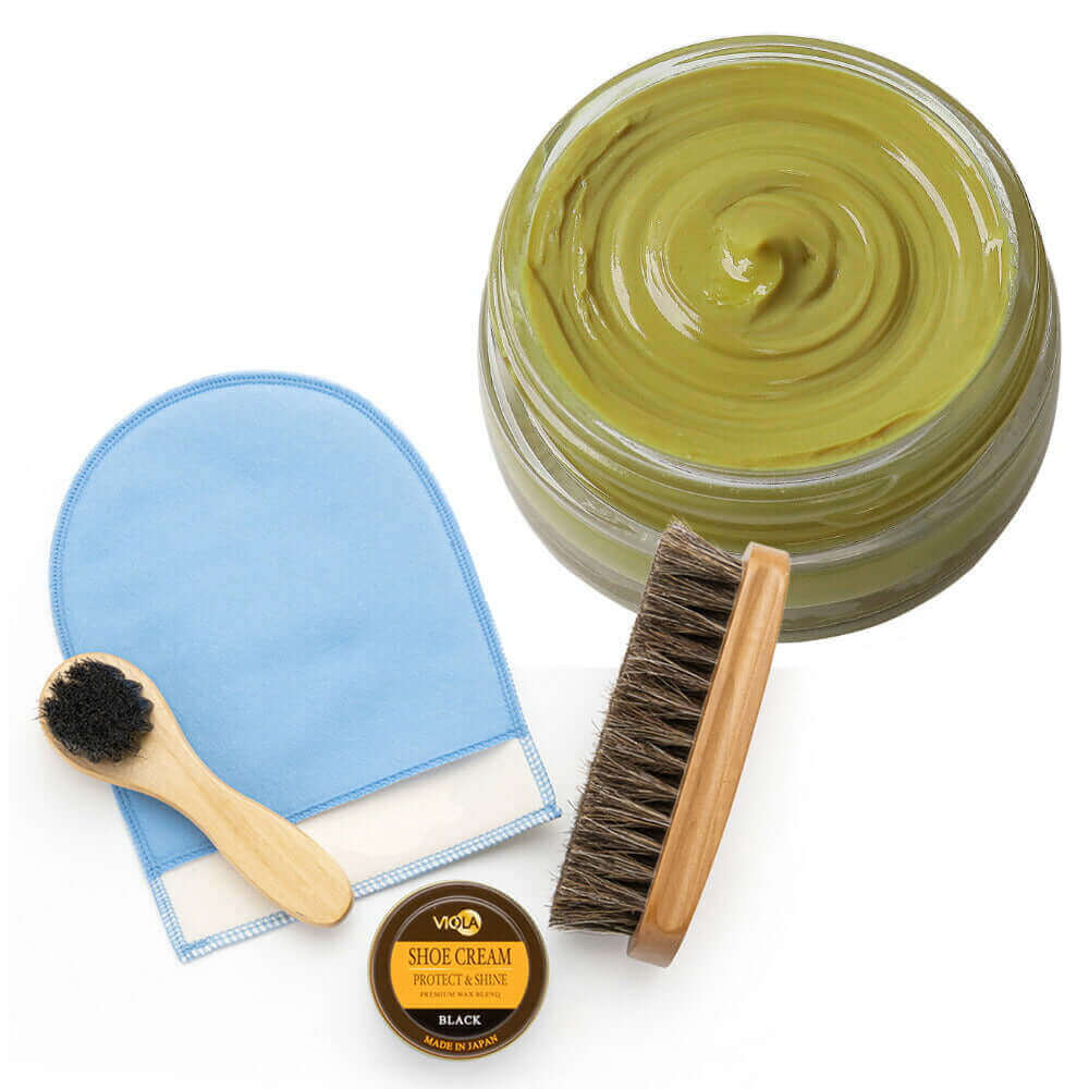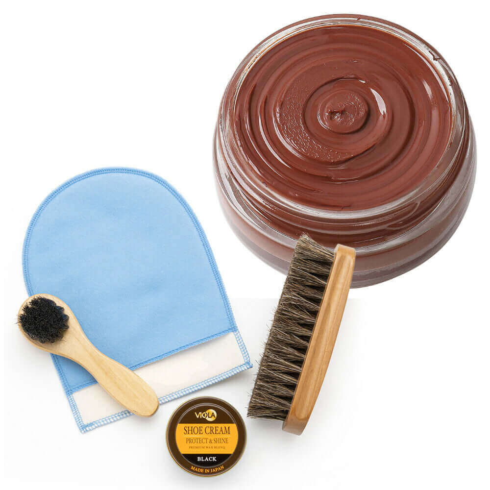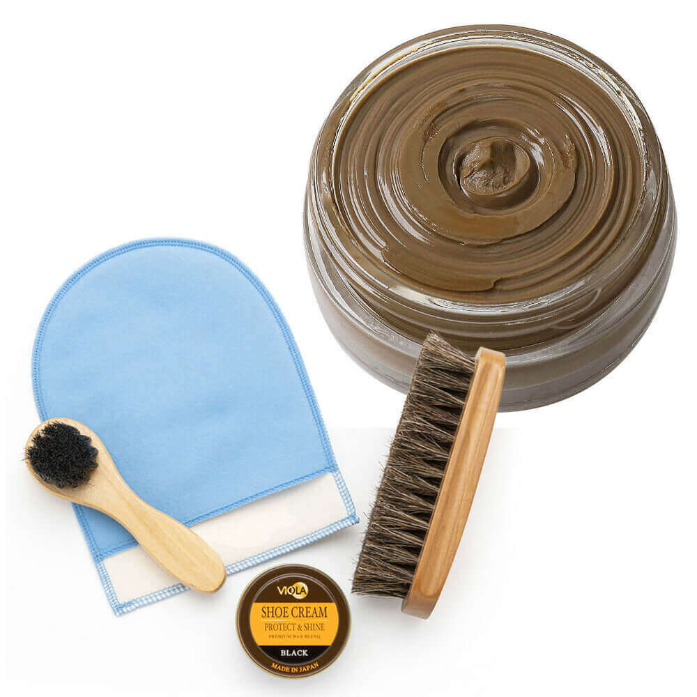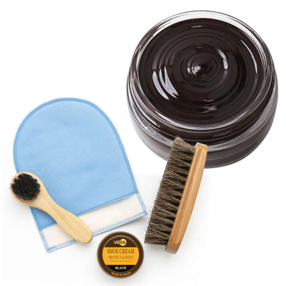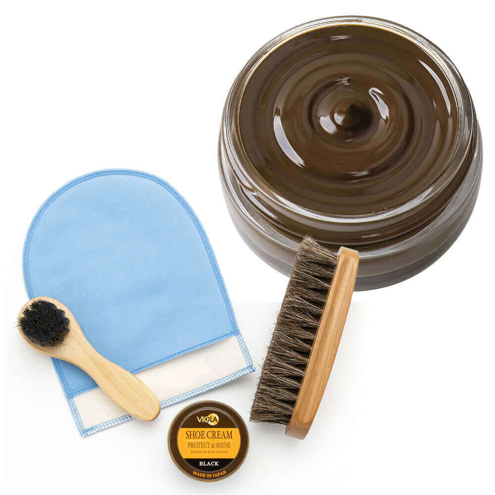 ヴィオラ シュークリームと馬毛ブラシ、ハンドルブラシのシンプルな靴磨きセット。仕上げ磨きミットのおまけ付で更にお得!シューケアセットの買い足しにもおすすめです。