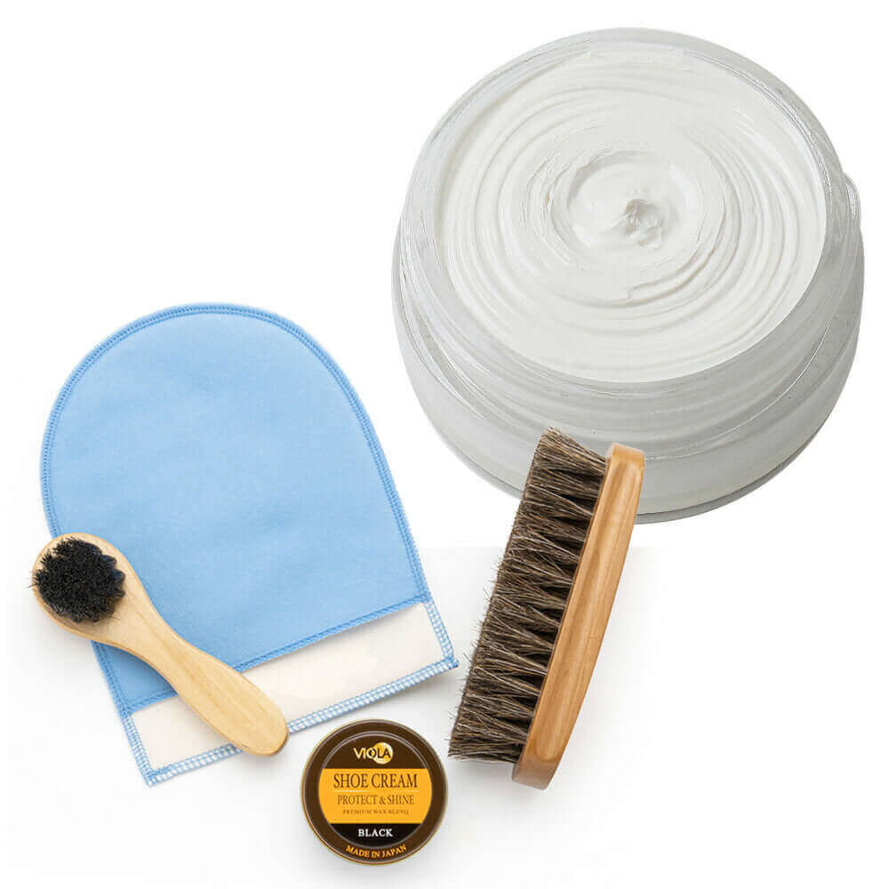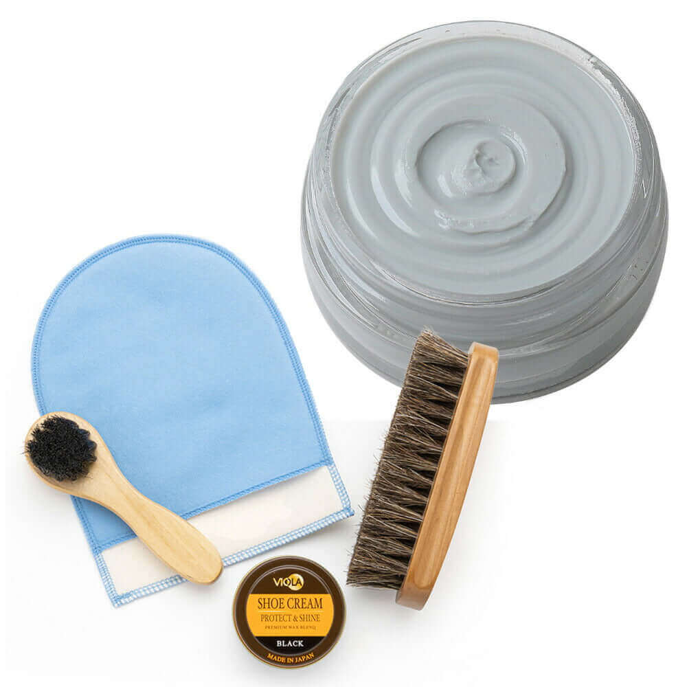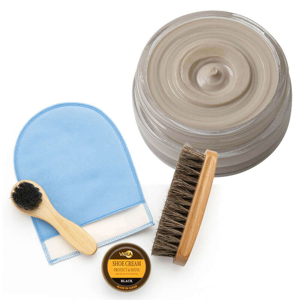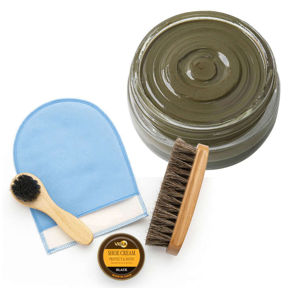 ヴィオラ シュークリームと馬毛ブラシ、ハンドルブラシのシンプルな靴磨きセット。仕上げ磨きミットのおまけ付で更にお得!シューケアセットの買い足しにもおすすめです。