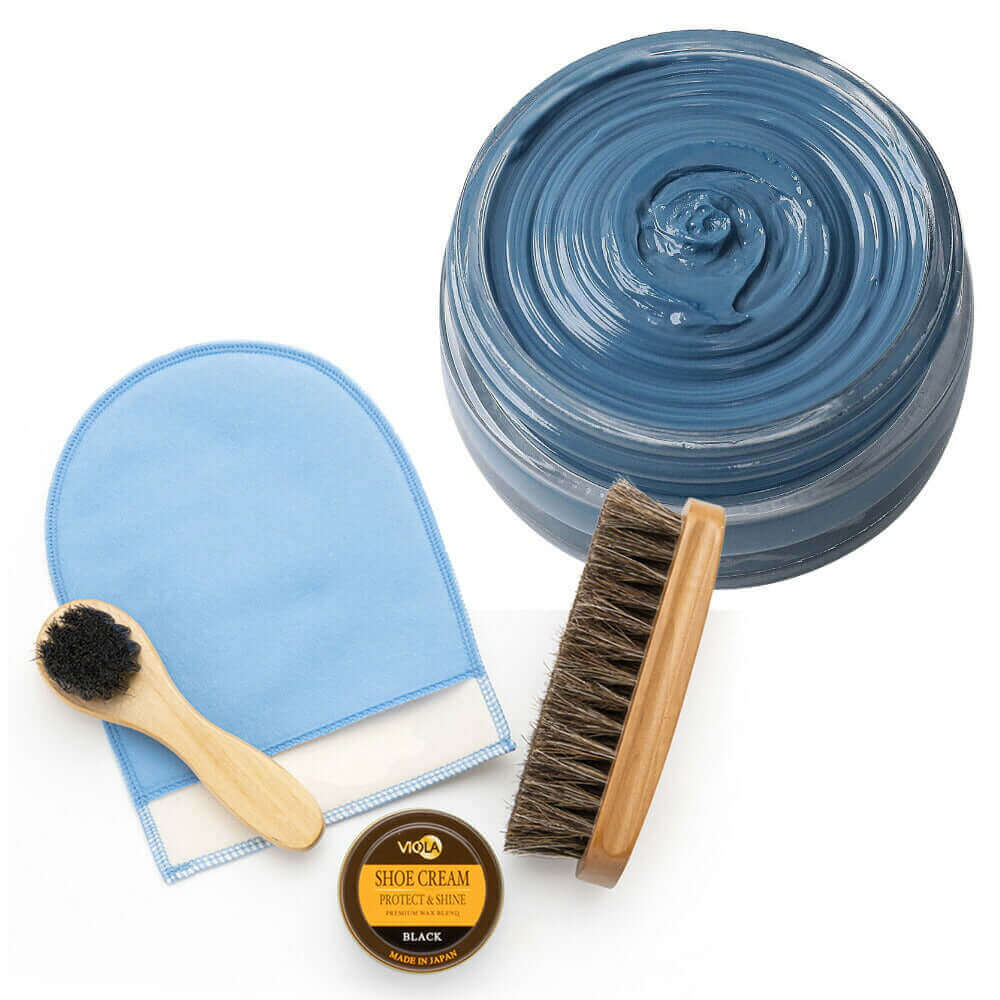 | 内容 | ●ヴィオラ シュークリーム×1個(42色の中から選択) ※その他の色にも変更可能。ここではいずれかの色を仮選択し、備考欄にご希望の色をご記入下さい。 ●ジュエル ホースヘアブラシ×1本 ●ハンドルブラシ×1本 ●ブリン 靴手入仕上げミット×1枚 |