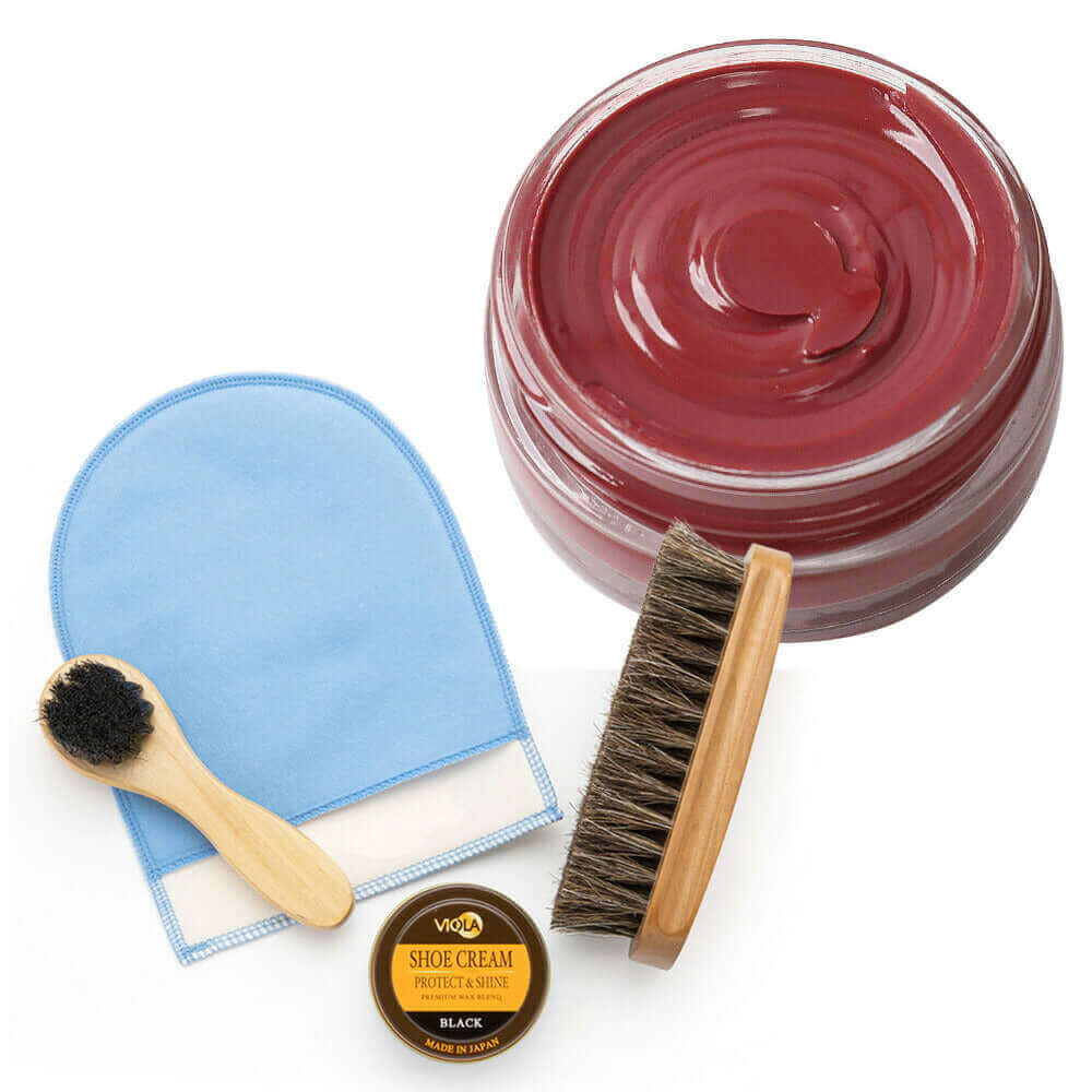 | 使用方法 | 1.ブラシで靴のホコリを払いクリーナーで汚れを落としておきます。 2.ヴィオラ シュークリームを付属のハンドルブラシに取り、薄く全体に伸ばします。 3.付属のジュエル ホースヘアブラシで磨きこみます。 4.付属のブリン 靴手入仕上げミットで仕上げ磨きをします。 |